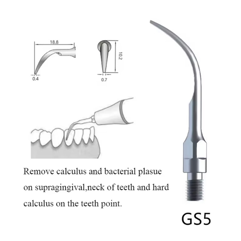 Насадка має злегка вигнуту та плоску робочу поверхню, що дозволяє їй ефективно видаляти скупчення зубного каменю та інших відкладень на